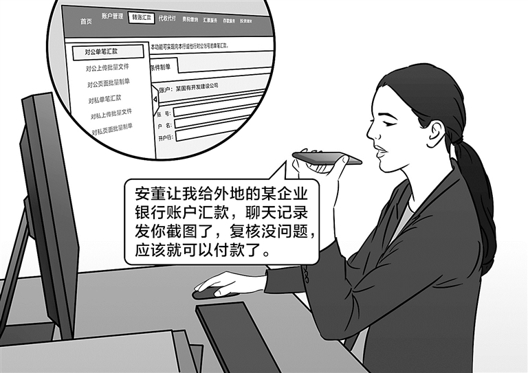 隨后,黃某某被拉入一個(gè)聊天群,并在該群收到備注名為安某某(該公司董事長(zhǎng))發(fā)來(lái)的消息,詢(xún)問(wèn)黃某某是否接到銀行需要年檢的通知,并在聊天群中“安排公司相關(guān)工作”,這讓黃某某輕信了安某某的身份。隨即,安某某要求黃某某向外地某企業(yè)銀行賬戶匯款。