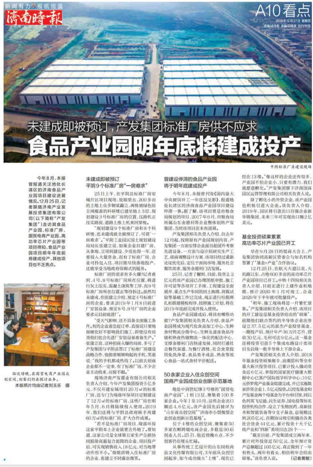 今年8月,本報曾刊發(fā)《國內(nèi)最大中央廚房開工一年還沒見影》,報道地處長清區(qū)的濟南食品產(chǎn)業(yè)園項目建設(shè)停滯一事。12月25日,記者跟隨濟南產(chǎn)業(yè)發(fā)展投資集團有限公司(以下簡稱“產(chǎn)發(fā)集團”)走訪其食品產(chǎn)業(yè)園、標(biāo)準(zhǔn)廠房、國貿(mào)電商產(chǎn)業(yè)園、高功率芯片產(chǎn)業(yè)園等項目,得知食品產(chǎn)業(yè)園項目明年年底前將建成投產(chǎn),其他項目也不乏亮點。