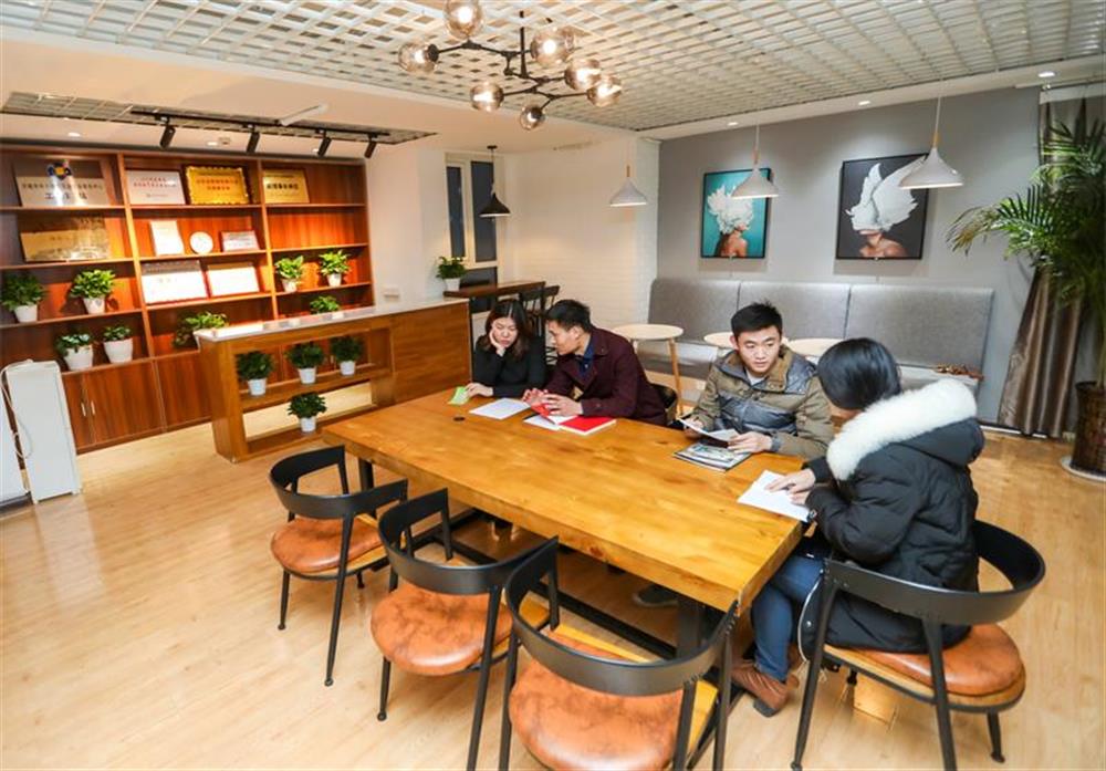 在4樓眾創(chuàng)空間,聚集著50多家在孵跨境電商企業(yè),多數(shù)都是90后創(chuàng)業(yè)人員。25日臨近傍晚6點,不少創(chuàng)客仍埋頭忙碌。在眾創(chuàng)空間打造的咖啡吧,幾個年輕人正探討業(yè)務(wù)。